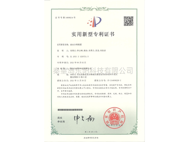 油水分離裝置-實(shí)用新型專利證書(shū)