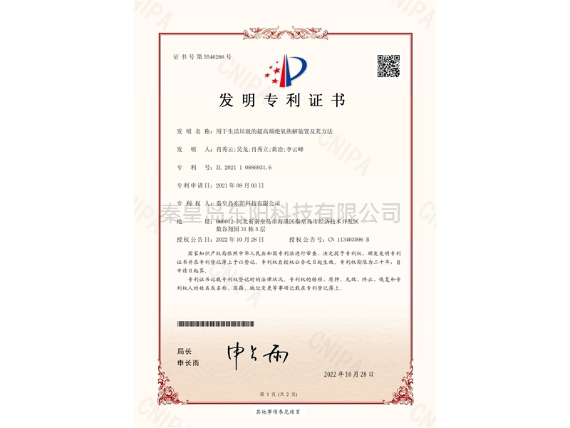 用于生活垃圾的超高頻絕氧熱解裝置及其方法-發(fā)明專利證書(shū)
