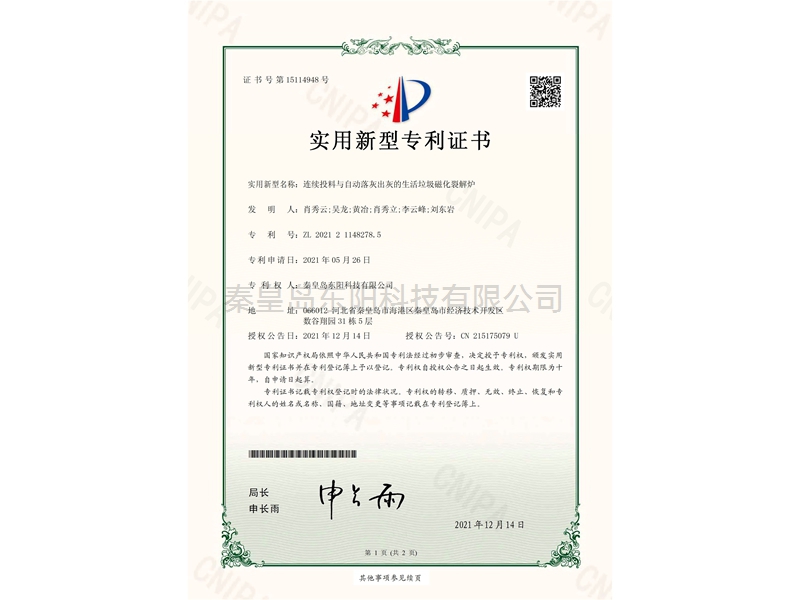 連續(xù)投料與自動(dòng)落灰出灰的生活垃圾磁化裂解爐-實(shí)用新型專利證書(shū)