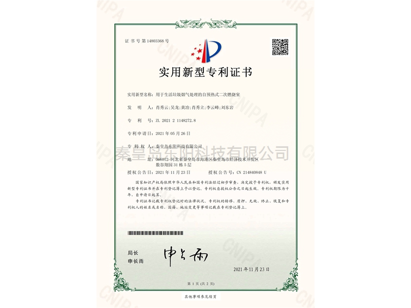 用于生活垃圾煙氣處理的自預(yù)熱式二次燃燒室-實(shí)用新型專利證書(shū)