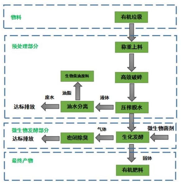 ?。?)餐廚垃圾經(jīng)破碎、壓榨預(yù)處理后的物料輸送入好氧發(fā)酵倉內(nèi),在適宜的倉內(nèi)環(huán)境中進行24h好氧發(fā)酵;